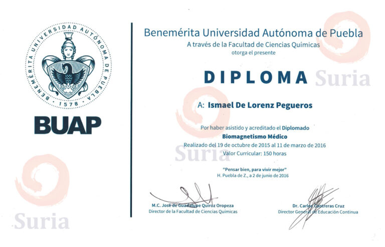 Egresado del diplomado en Biomagnetismo Médico en la Facultad de Ciencias Químicas de la Benemérita Universidad Autónoma de Puebla.
