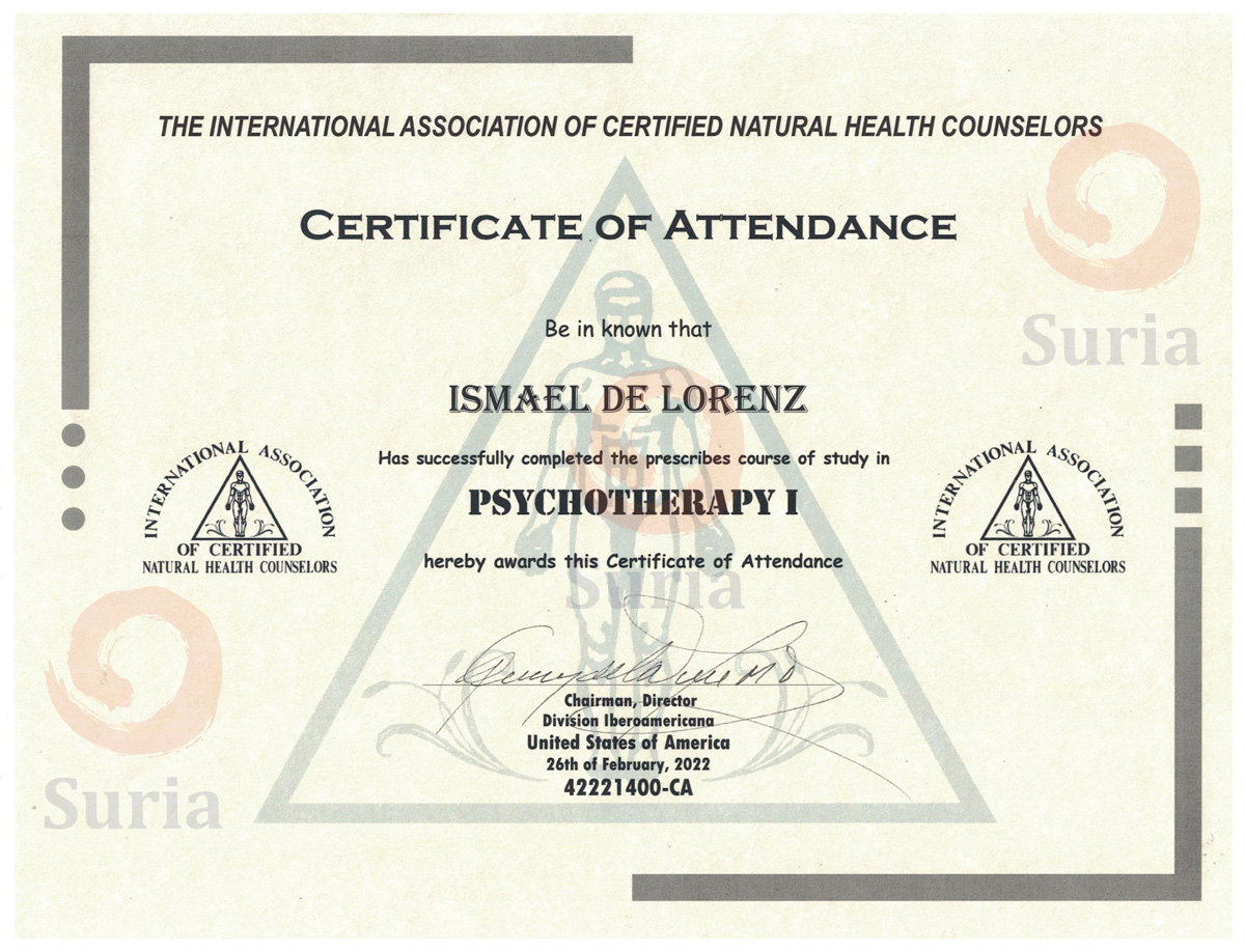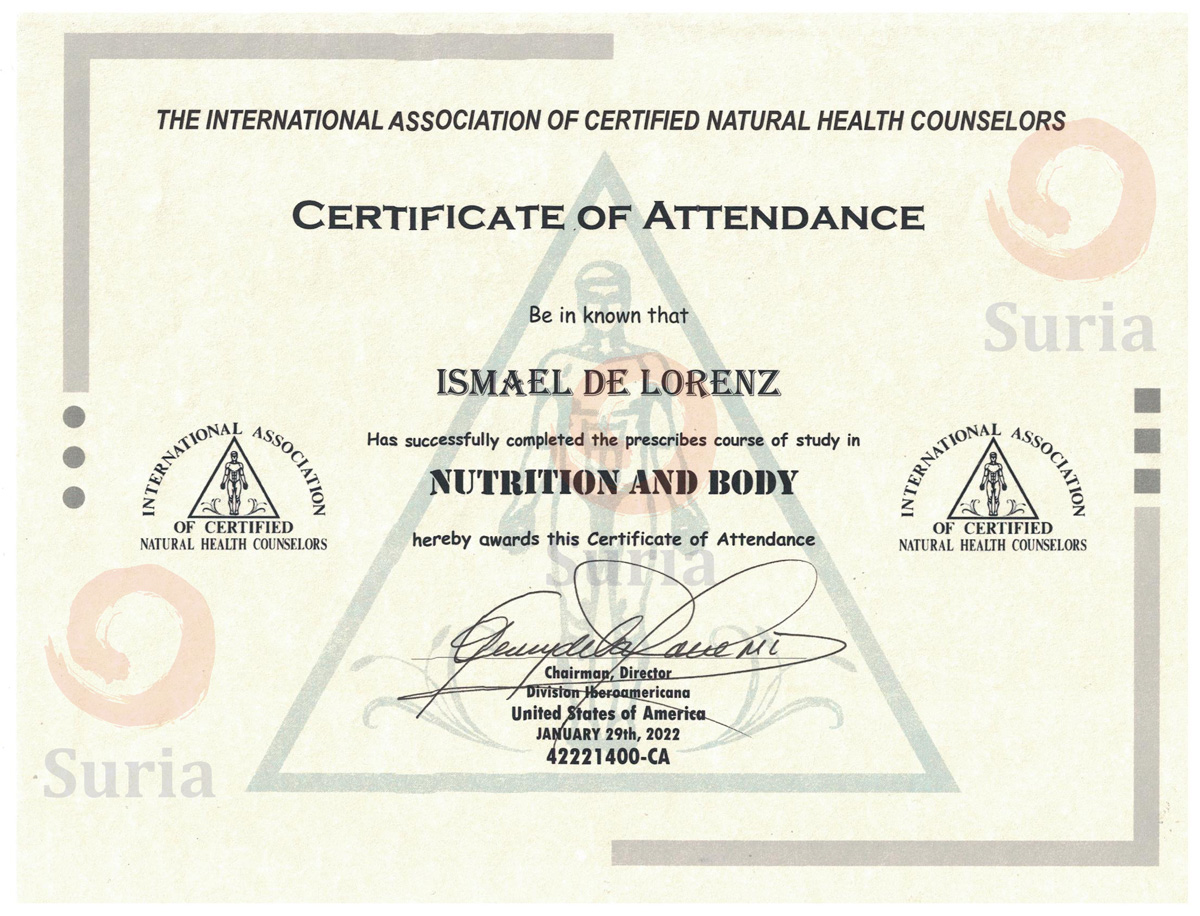 Se encuentra en proceso de certificación como Certified Natural Health Counselor y como Certified Emotional Consultant en The International Association of Certified Natural Health Counselors en Los Angeles, California.